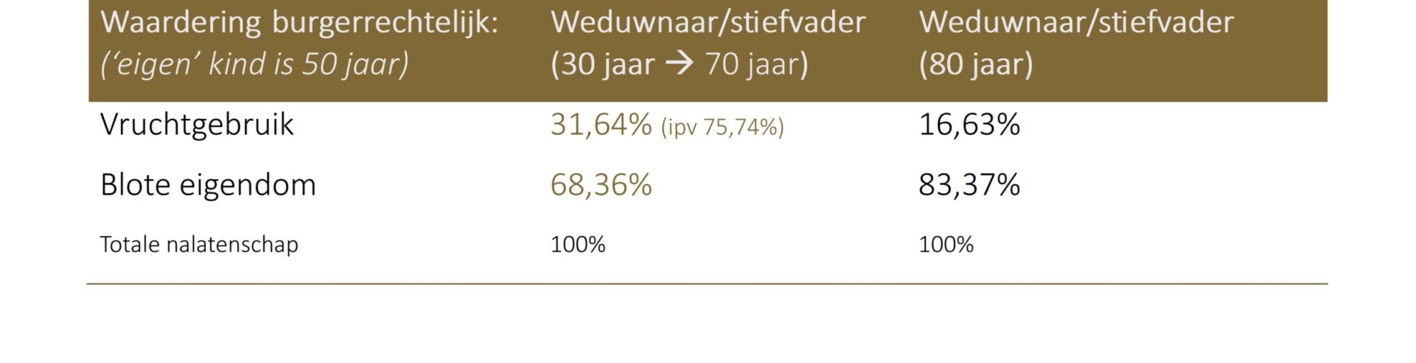 Beeld je in dat elk van de overleden vrouwen een kind van 50 jaar had uit een vorige relatie. Bij de weduwnaar/stiefvader van 80 jaar blijft voormelde waardering behouden. Bij de weduwnaar/stiefvader van 30 jaar daarentegen zal bij een omzetting rekening gehouden worden met een vruchtgebruiker van (50 jaar + 20 jaar =) 70 jaar. De weduwnaar/stiefvader zal zo niet 75,74% ontvangen, maar wel 31,64% ontvangen voor zijn vruchtgebruik!